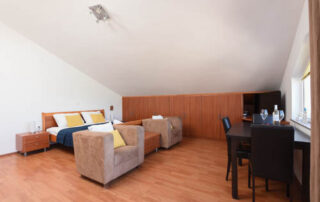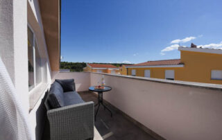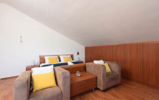 These open plan studio apartments are suitable for up to 2 people and are located on the third floor. They consist of an air-conditioned bedroom with a 180 x 200 cm bed, living room with a sofa, SAT LCD TV  dining area, kitchenette (stove and oven, microwave, electric kettle, coffee machine, refrigerator, crockery, cutlery, and cooking utensils) spacious wardrobe, and bathroom with a shower. This studio apartment has a private open balcony overlooking the neighbourhood and beautiful sea view.